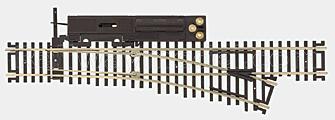 Стрелка прямая правая, с электроприводом, радиус 457,2 мм, серия Snap-Switch® Высота рельса 2,1 мм, В комплекте: сама стрелка, короткая (1/3 длины от стандартной) радиусная секция 18 " (457,2 мм), переключающий механизм с электроприводом # 585 для переключения стрелки, с проводами для подключения переключателя, переключатель для управления электроприводом, набор винтов для переключателя (для подключения проводов, для подключения питания электропривода, для закрепления переключателя на макете). Переключатели от разных стрелок можно состыковывать друг с другом, устанавливая их в одну линию, причем питание можно подключить только к первому переключателю, остальные будут запитываться от него по общим контактам