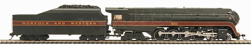 Паровоз 4-8-4 класс J. Принадлежность Norfolk & Western #603. Установлен дымогенератор, а также универсальный цифровой декодер со звуком Proto-Sound 3 с оригинальной системой синхронизации дыма и звука Puffing ProtoSmoke System, работающий как с аналогом, так и с цифрой. Модель выполнена из металла. В комплекте прилагается жидкость для дымогенератора. Рекомендуется минимальный радиус 18 дюймов (457,2 мм).