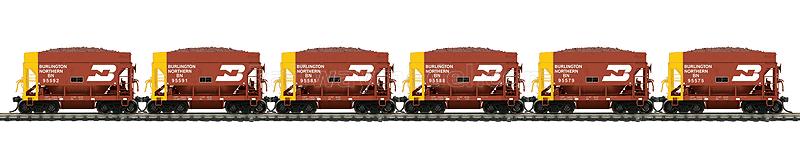 Набор из шести 70-тонных вагонов для перевозки руды (т.н. “Ore Jennies”) с грузом. Принадлежность Burlington Northern (Boxcar Red, yellow)